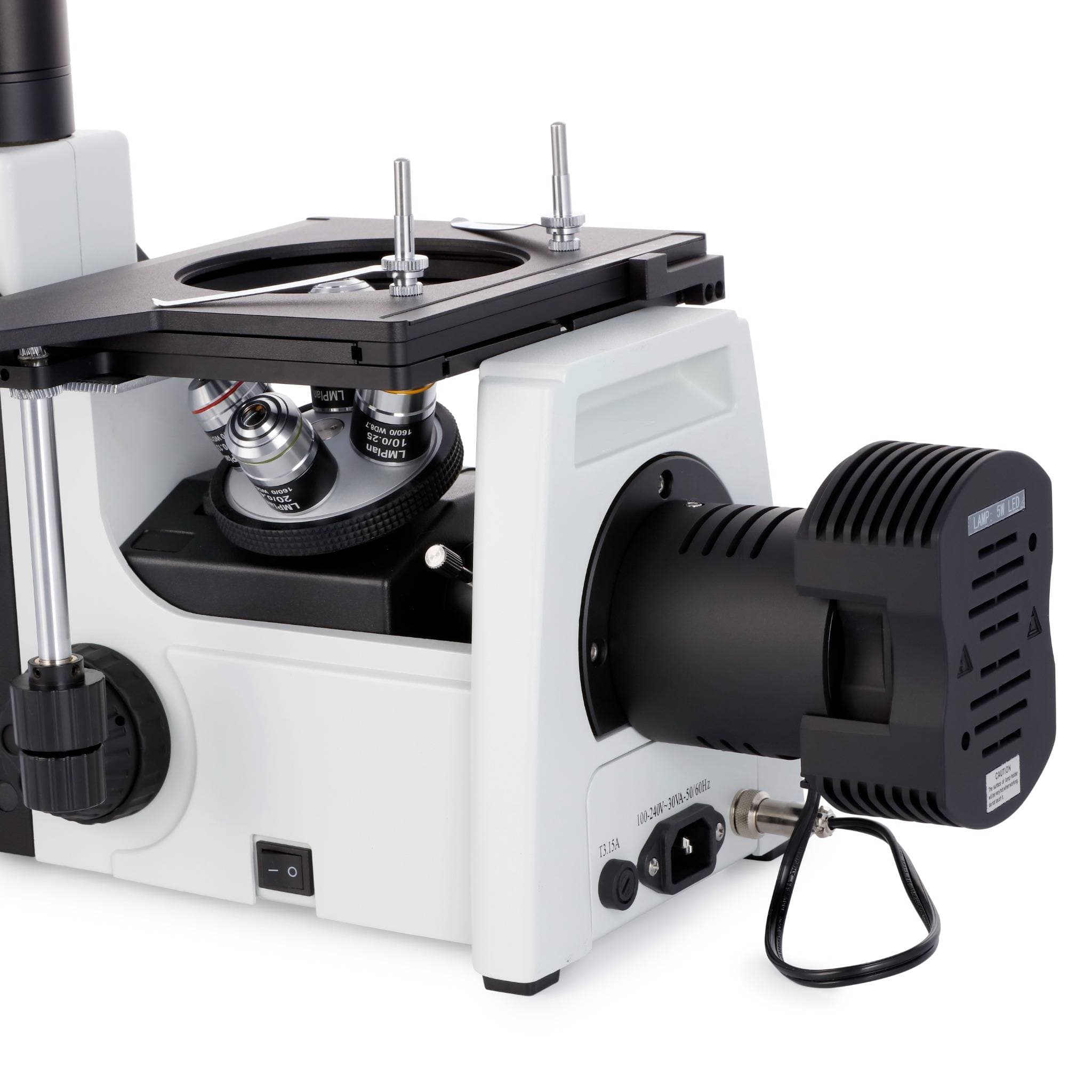 El microscopio invertido AmScope ME1200T está diseñado para aplicaciones metalúrgicas y geológicas, ofreciendo iluminación LED epifluórica de 5 W con rango de voltaje amplio (90‑240 V). Cuenta con un cabezal trinocular de 45° que permite la conexión de cámaras USB 2.0 o 3.0 para captura de imágenes y video. Incluye cuatro objetivos planacromáticos de 5×, 10×, 20× y 50× con apertura numérica de 0,1‑0,65, proporcionando imágenes nítidas desde 50× hasta 500× con los oculares de 10×. La etapa mecánica de 180 mm × 155 mm tiene acabado resistente a manchas y ofrece desplazamiento de 75 mm × 40 mm con controles de posición precisos. El enfoque coaxial de gran y pequeño permite un ajuste fino y una tensión de enfoque controlada para minimizar la vibración. El sistema óptico está completamente recubierto, garantizando alta resolución y corrección plana. La distancia de resolución mínima es de 0,001 mm, adecuada para inspección de superficies metálicas. El dispositivo incorpora ajustes de distancia interpupilar (55‑75 mm) y dioptrías ajustables en ambos tubos oculares.