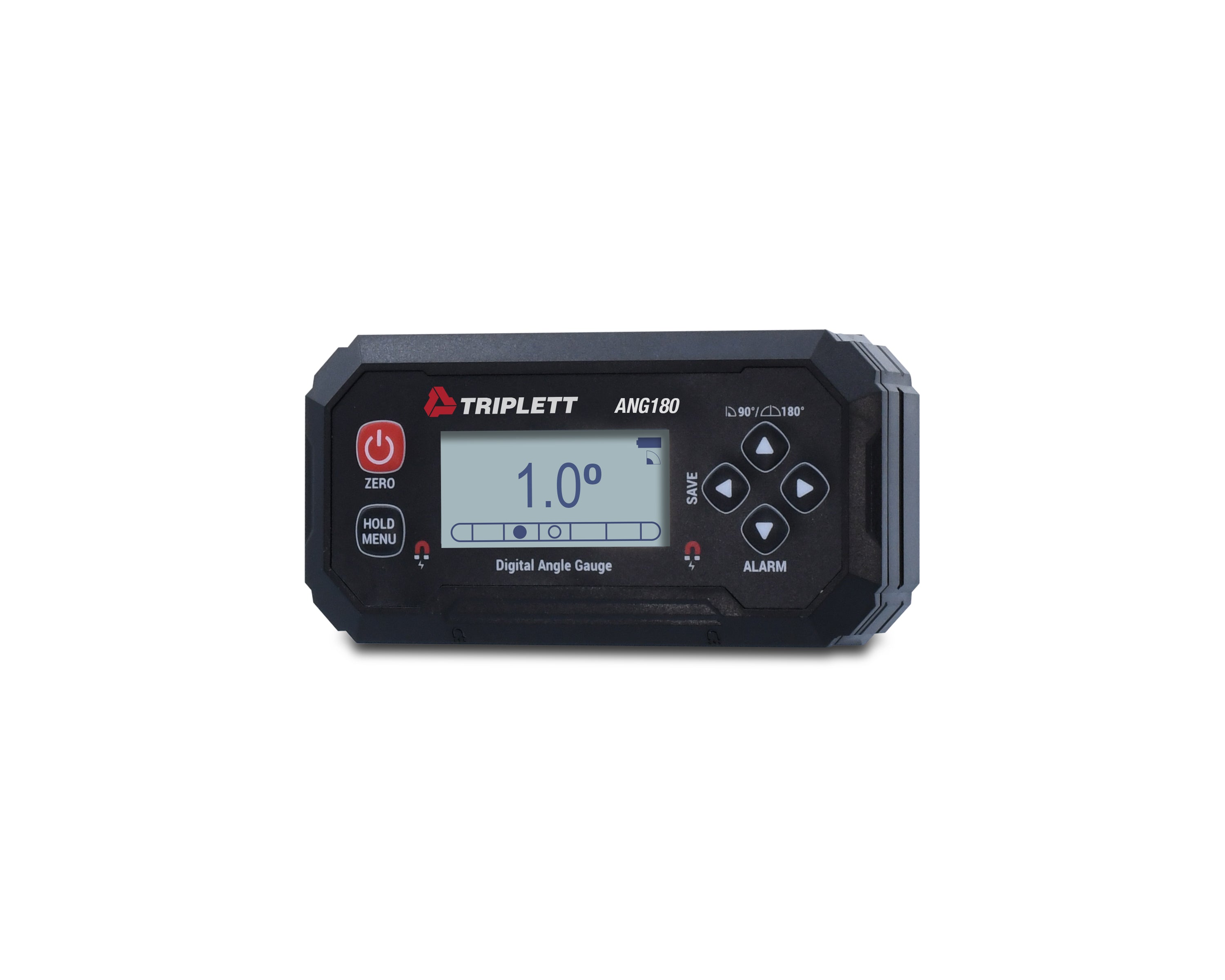 El medidor de ángulos digital Triplett modelo ANG180 detecta el grado de desviación respecto al nivel real, de 0 a 180°, con una resolución de 0,1°. Ofrece calibración de uno o dos ejes, y un ángulo objetivo programable por el usuario con alarma sonora. El botón Cero establece un plano de referencia distinto del nivel horizontal real. La base magnética se fija a tuberías, sierras de mesa y otras superficies ferromagnéticas, y las ranuras en V en las superficies superior e inferior se alinean fácilmente con el eje de conductos y tuberías. Al colocarlo en posición horizontal, se convierte en un nivel de diana. El botón Hold congela la lectura en la pantalla, el apagado automático prolonga la vida útil de las pilas y un icono de pila en pantalla indica cuándo es necesario cambiarlas. Incluye dos pilas AA. 1 año de garantía.