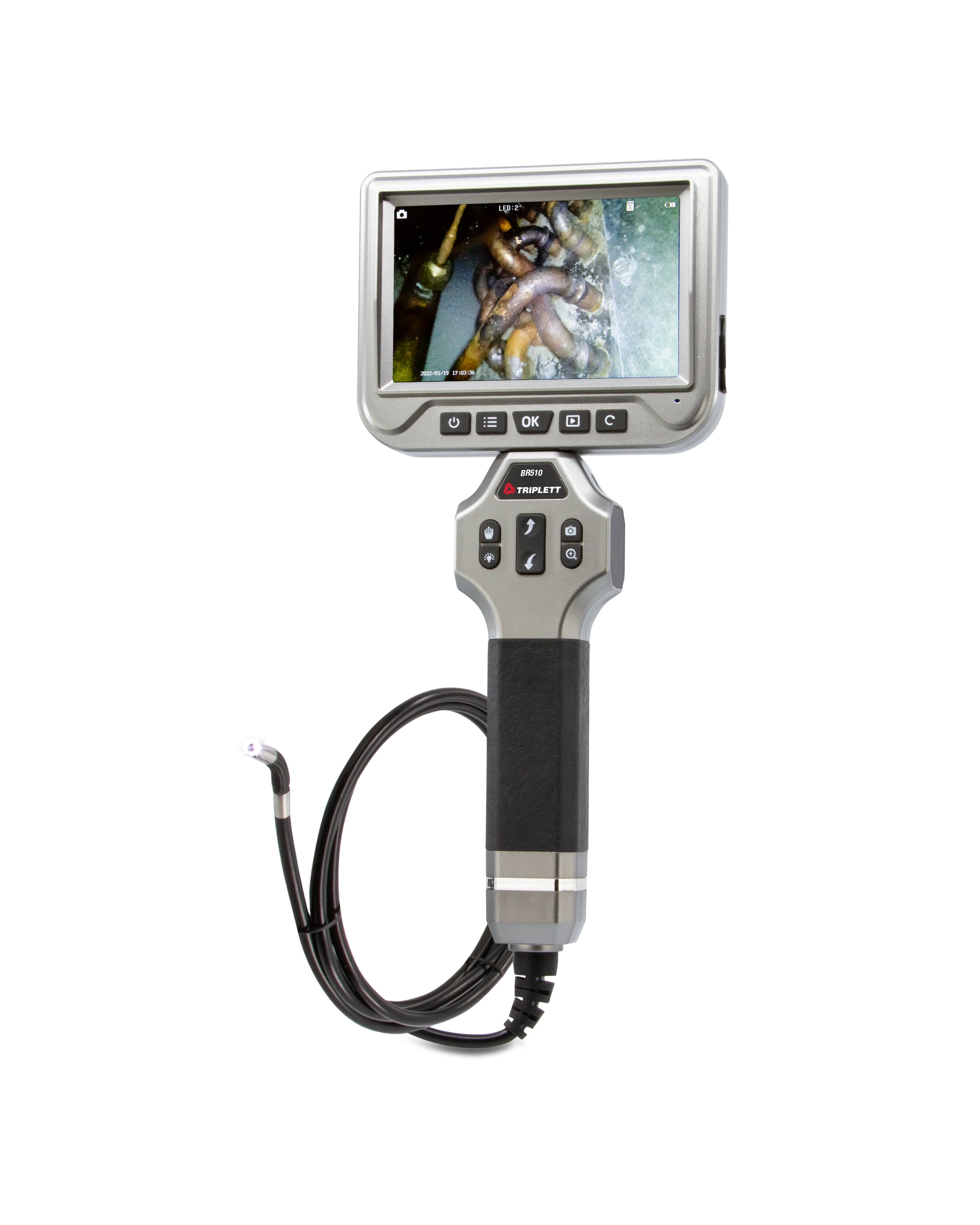 La cámara de inspección con boroscopio articulado de alta definición Triplett BR510 le permite ver detrás de paredes y desagües, lo que le ahorrará tiempo y dinero en cualquier reparación o instalación. Cuenta con una cámara impermeable de 6 mm (IP67) con una sonda articulada bidireccional que se ajusta 180° en ambas direcciones. Sus 6 LED ajustables con 3 niveles de brillo pueden iluminar áreas completamente oscuras para su inspección. Cuenta con una pantalla LCD TFT a color de 5" con una resolución de 1920 x 1080, reloj/calendario integrado y capacidad para grabar vídeo (.AVI) e imágenes (.JPG). Visualice los vídeos o imágenes capturados en la pantalla o transfiéralos a su PC mediante la interfaz USB o una tarjeta SD extraíble. Puede almacenar hasta 19 000 imágenes/20 minutos de vídeo (archivos de 3 minutos) en la tarjeta SD de 4 GB incluida. Función de congelación de vídeo durante la grabación. Incluye boroscopio, sonda articulada de 1,5 m con cámara de 6 mm, batería recargable de polímero de litio de 5 V, tarjeta microSD, cable USB y accesorios para la cámara (imán, gancho y tapa protectora). 1 año de garantía.