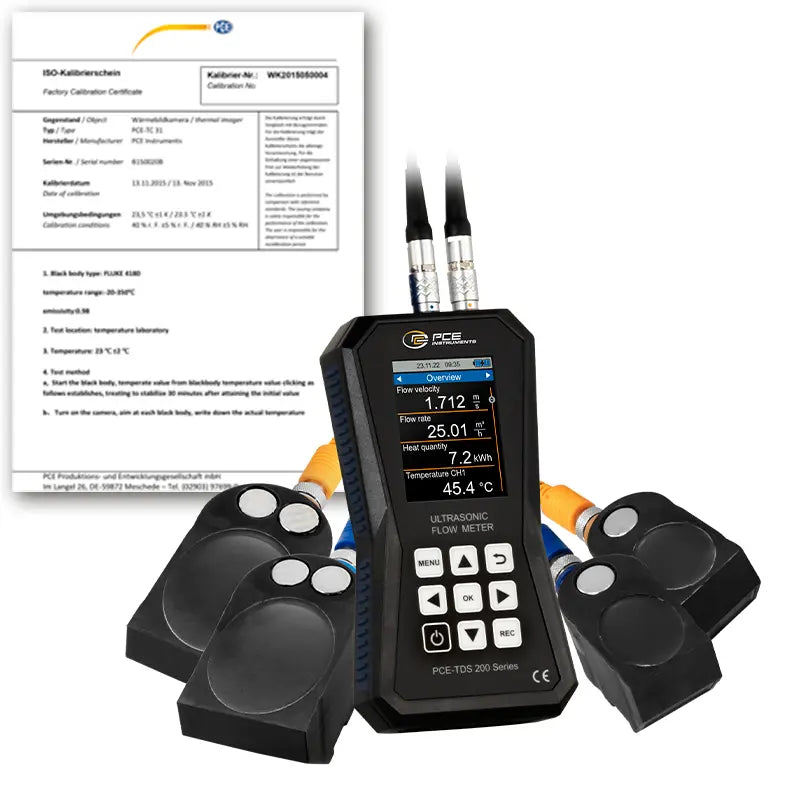 Caudalímetro ultrasónico con memoria de 32 GB / Rango: ±32 m/s / Reproducibilidad: ±0,5 % del valor de medición / Diferentes sondas disponibles / Alarma / Pantalla LCD de 2,8" / Para cualquier medio / Certificado de calibración ISO incluido