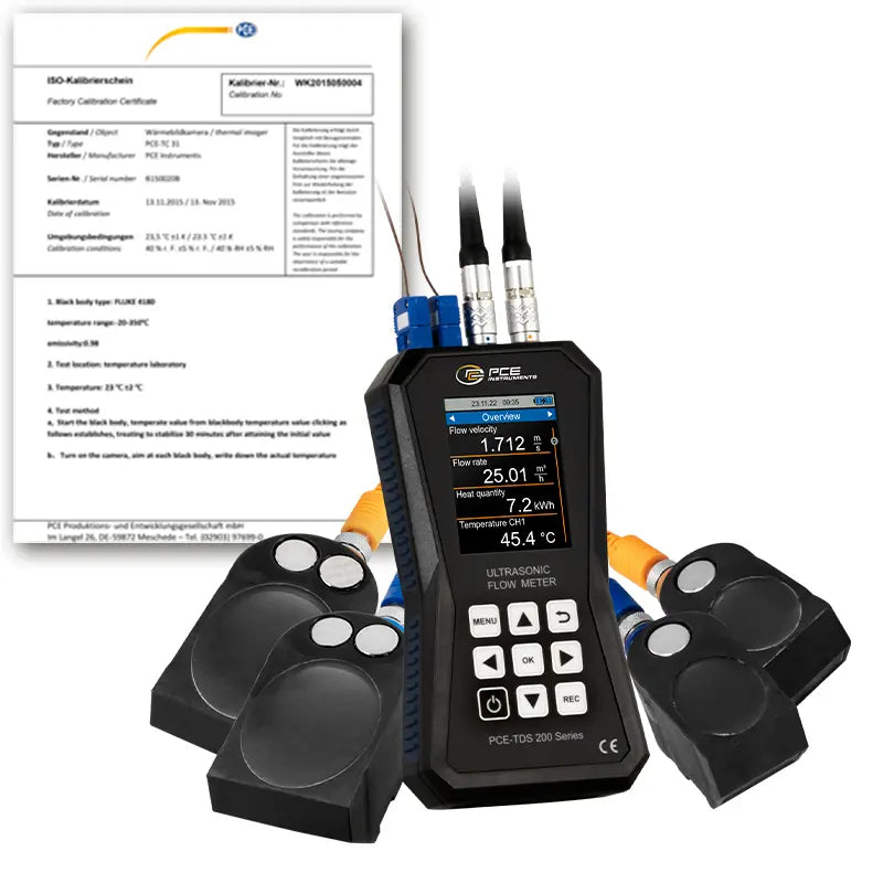 Caudalímetro ultrasónico con memoria de 32 GB / Rango: ±32 m/s / Reproducibilidad: ±0,5 % del valor de medición / Diferentes sondas disponibles / Alarma / Pantalla LCD de 2,8" / Para cualquier medio / Certificado de calibración ISO incluido