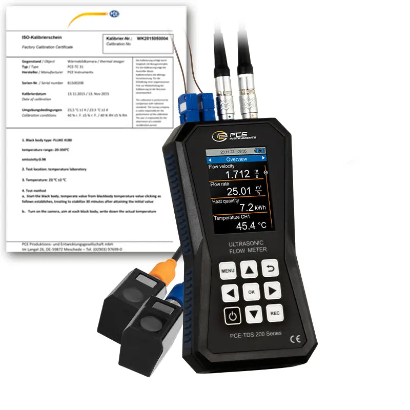 Caudalímetro ultrasónico con memoria de 32 GB / Rango: ±32 m/s / Reproducibilidad: ±0,5 % del valor de medición / Diferentes sondas disponibles / Alarma / Pantalla LCD de 2,8" / Para cualquier medio / Certificado de calibración ISO incluido
