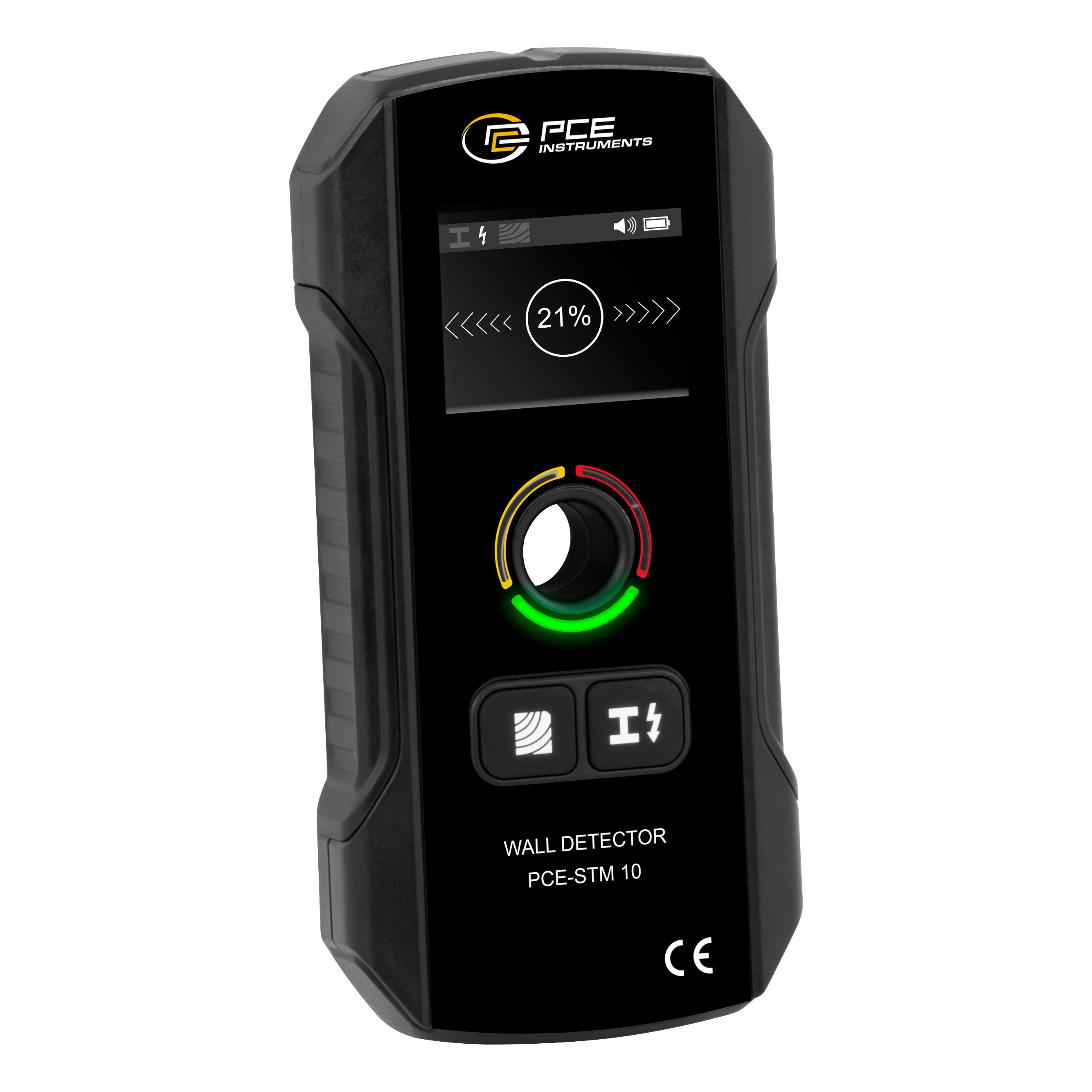 El detector de cables está equipado con una pantalla LCD de 1,9 pulgadas que ofrece una visualización gráfica de la exploración. Un sistema de señalización compuesto por LED de colores, señales acústicas y flechas direccionales proporciona rápidamente información precisa sobre la proximidad y la posición del objeto detectado. El sistema de LED indica en verde la ausencia de obstáculos, en amarillo los objetos cercanos y en rojo un obstáculo situado directamente debajo del escáner. El detector de cables dispone de tres modos de detección: modo objetos metálicos, modo vigas de madera y modo cables con corriente. En los modos de metal y cables de corriente, el dispositivo muestra la intensidad de la señal en forma de porcentaje. En el modo de detección de vigas de madera, el detector de cables reconoce tanto el centro exacto como los bordes de las vigas de madera, lo que permite determinar con precisión su posición y tamaño.