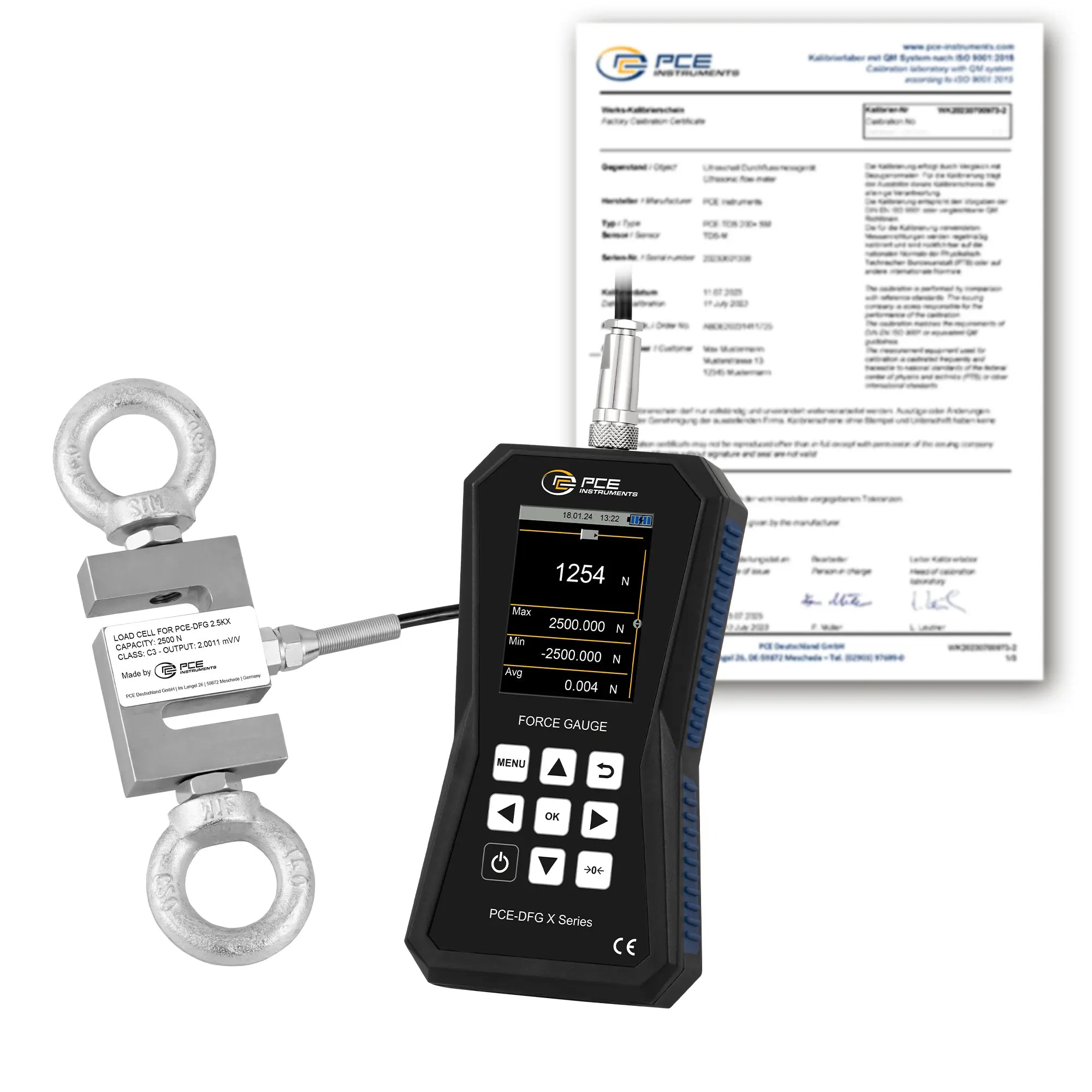 El dinamómetro mide con gran precisión las fuerzas de tracción y compresión. Con frecuencia, la medición de tales fuerzas se realiza en los laboratorios de ensayo para determinar el límite elástico, la fuerza de rotura o la fuerza necesaria para accionar botones o interruptores. El dinamometro se suministra con una célula de carga externa para medir fuerzas hasta 2500 N. Las células de carga pueden ser equipadas con pernos o ganchos con rosca M12. Existe también la posibilidad de adaptar diferentes dispositivos propios a la célula de carga utilizando esa rosca.