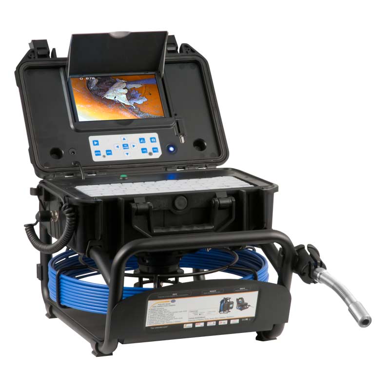 El endoscopio de tuberías se envía en un maletín resistente al agua. El maletín del endoscopio de tuberías está montado directamente sobre el tambor. Gracias a ello se reduce el espacio del endoscopio. El endoscopio integra un acumulador que permite trabajar de forma móvil. Puede cargar el endoscopio a través del adaptador de corriente o el adaptador para vehículos.