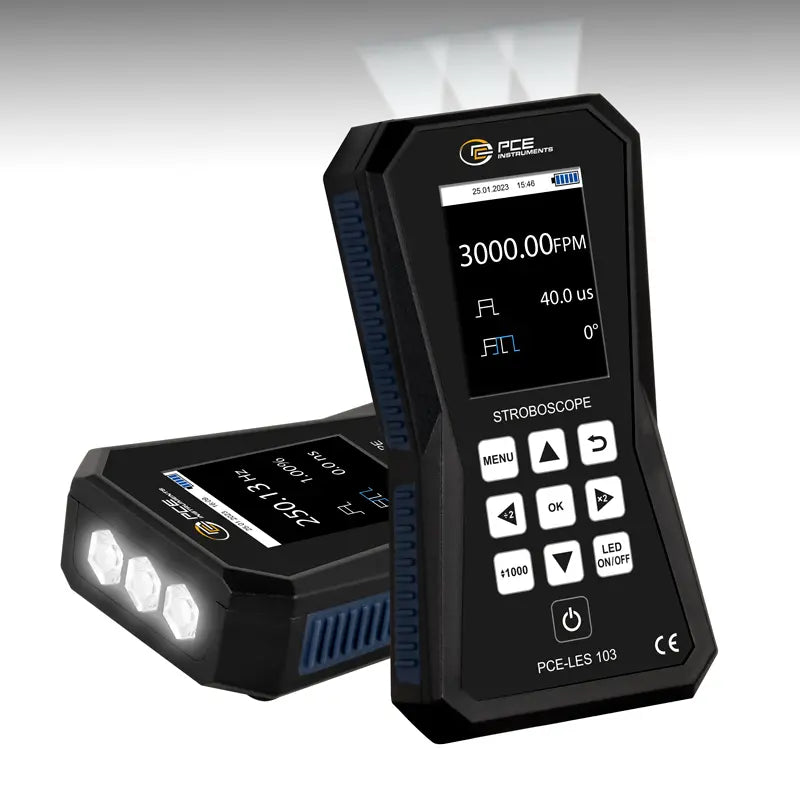 Con nuestro estroboscopio LED puede analizar el movimiento de máquinas giratorias de forma rápida y sencilla. El estroboscopio LED está equipado con 3 LED de alta potencia, que juntos generan una intensidad luminosa de 11730 lux a 20 cm y 1000 Hz. El estroboscopio LED permite ajustar con precisión la frecuencia de destello tanto en FPM como en Hz. Además, es pequeño, manejable y portátil gracias a su batería recargable.