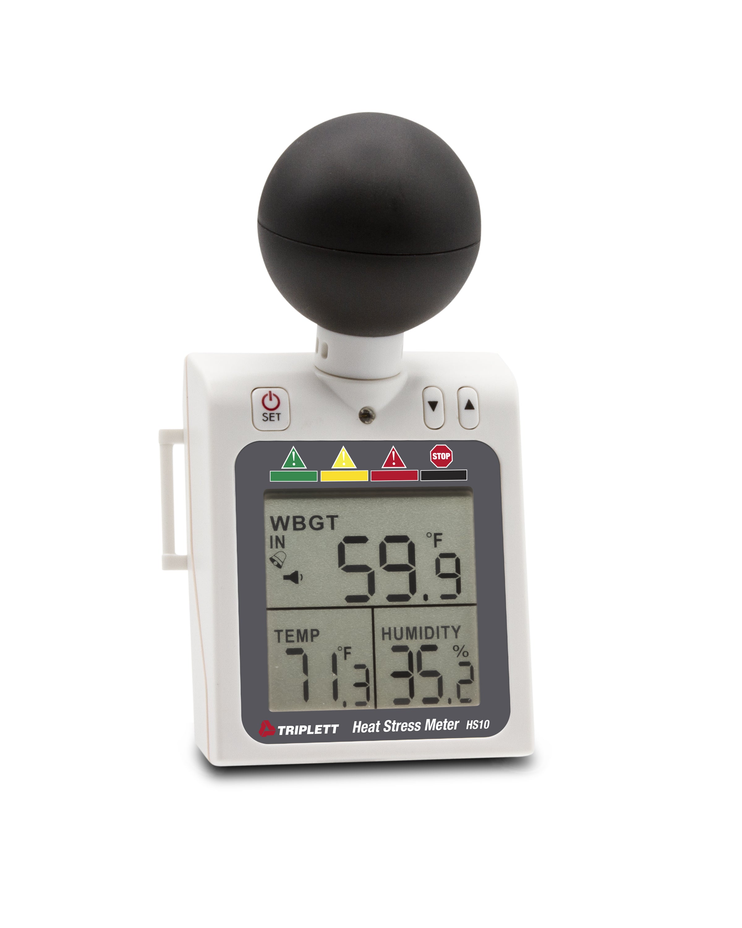 El medidor de estrés térmico Triplett HS10 WBGT (temperatura de bulbo húmedo y globo) monitorea el índice de calor en interiores y exteriores para ayudar a limitar el riesgo de lesiones por calor. Muestra simultáneamente la temperatura del aire, la humedad y la temperatura de bulbo húmedo y globo (WBGT) o el índice de calor, y se actualiza cada 20 segundos. Cuenta con alarmas sonoras y visuales programables de WBGT e índice de calor con volumen ajustable (75 dB/60 dB/silencio) y 4 indicadores que muestran el nivel de alerta de estrés térmico (Precaución, Precaución extrema, Peligro, Peligro extremo). Un interruptor de función de entrada/salida mide el WBGT con o sin luz solar directa. Conmutable entre °F y °C. Soporte de pared para colocar el medidor en una posición permanente y soporte de trípode para tener las manos libres al tomar mediciones durante períodos prolongados. Incluye 2 pilas AAA y correa para el brazo. 1 año de garantía. Para entrenamientos y eventos deportivos al aire libre, construcción, fundiciones de hierro y acero, plantas de cocción de ladrillos, instalaciones de vidrio, salas de calderas, sitios mineros y otras áreas donde se deben monitorear los niveles del índice de calor.