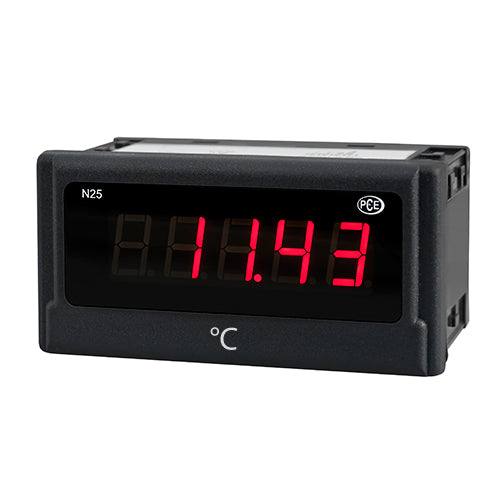 El indicador de temperatura PCE-N25T es muy apto para indicar la temperatura. El indicador de temperatura procesa señales de termoelementos y sensores Pt100. Al poder escalar libremente la señal de entrada, el campo de uso de este indicador de temperatura es muy amplio. El usuario podrá leer los valores actuales en la pantalla de 5 dígitos. La alimentación opcional del sensor de 24 V permite una conexión directa de sensores de 2 hilos o transductores, lo que simplifica el uso del indicador de temperatura. Las tres versiones del indicador de temperatura se diferencia también en la alimentación. Además de una alimentación de 230 V, también puede alimentarlo con 20 ... 20 V. La configuración se realiza a través del software LPCon. Puede realizar ajustes o leer los datos a través del adaptador de programación PCE-PD14. Con este software también puede guardar la configuración y volver a cargarla.