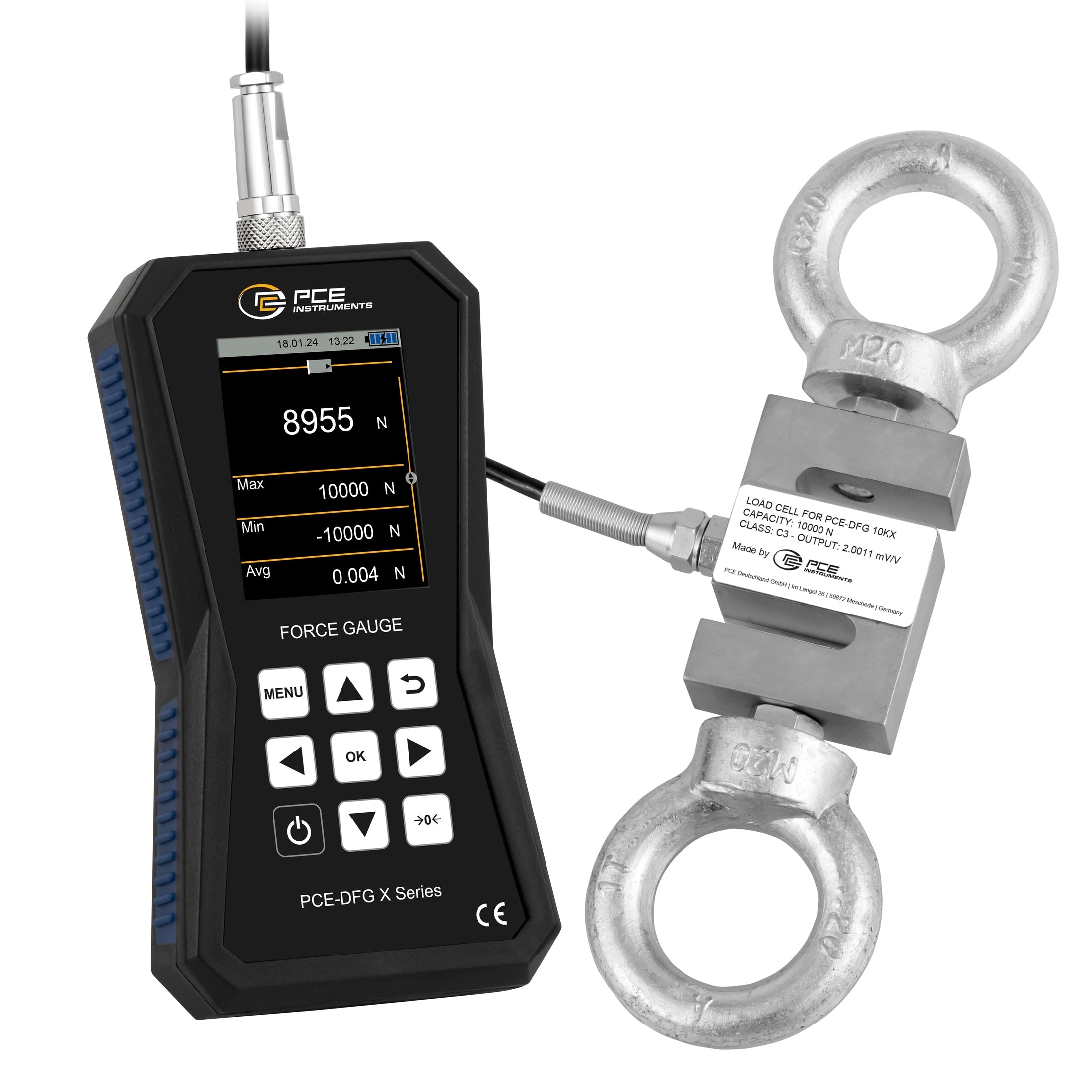 Dinamómetro con célula externa hasta 10000 N / Diferentes modos de alarma / Pantalla gráfica / Registro de datos / Incluye software / Incluye pernos