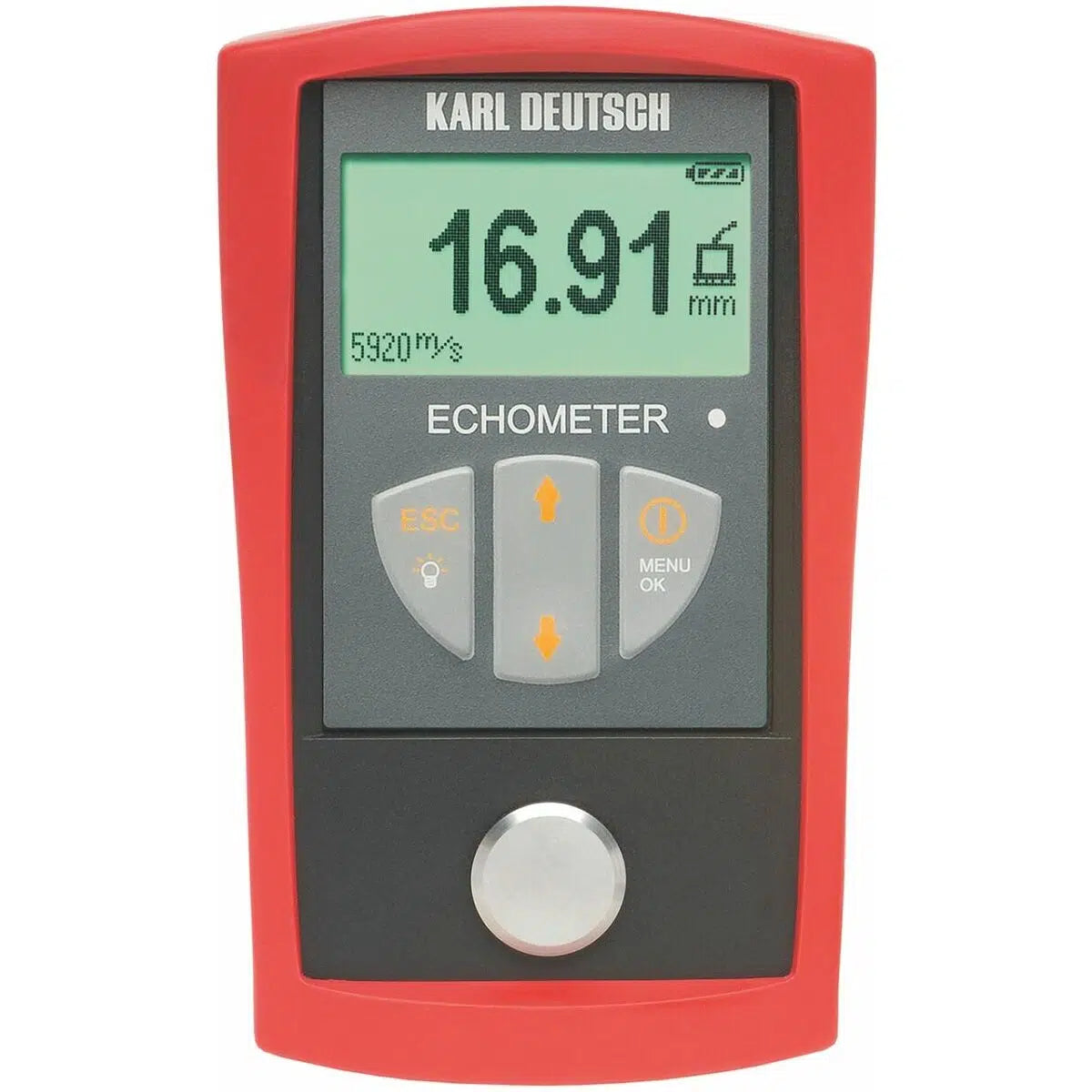 Instrumento pequeño y manejable de medición del grosor de paredes por ultrasonidos, con reconocimiento automático del palpador. Materiales que se pueden someter a prueba: todos los materiales conductores del sonido, como acero, hierro, metales no férricos, plásticos, vidrio, cerámica, etc. Medición de grosores de pared y de velocidad del sonido en un solo aparato.