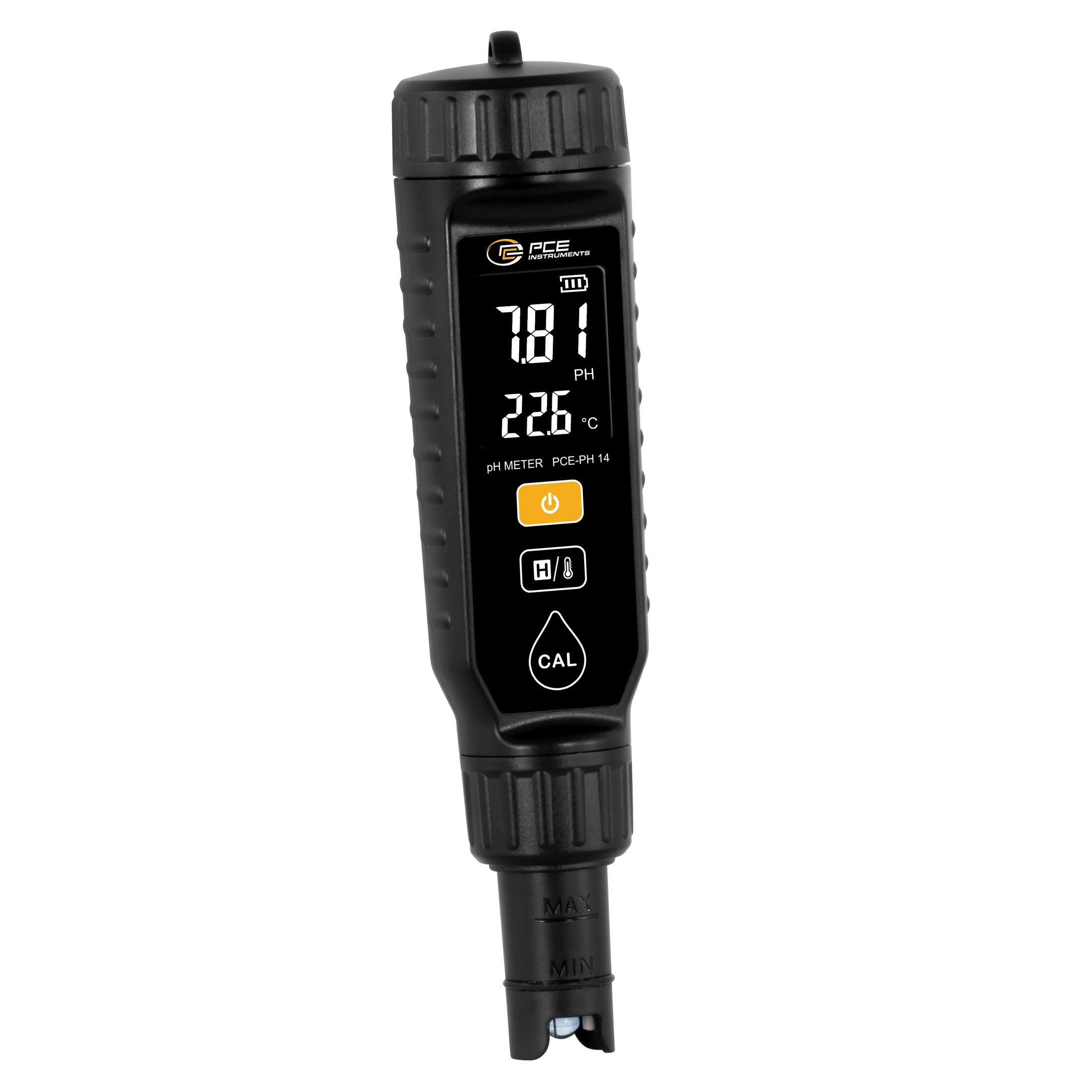 Los rangos de medición de pH son de 0 ... 14 pH con una resolución de 0,01 pH y para la temperatura de 0 ... 60 °C o 32 ... 140 °F con una resolución de 0,1 °C/°F. La calibración automática garantiza una precisión de medición fiable, mientras que la desconexión automática tras 10 minutos de inactividad prolonga la autonomía de la batería. El medidor de pH es compacto, fácil de usar y muestra los valores de pH y temperatura simultáneamente en la pantalla LCD a color. También indica el estado de carga de la batería de litio integrada.