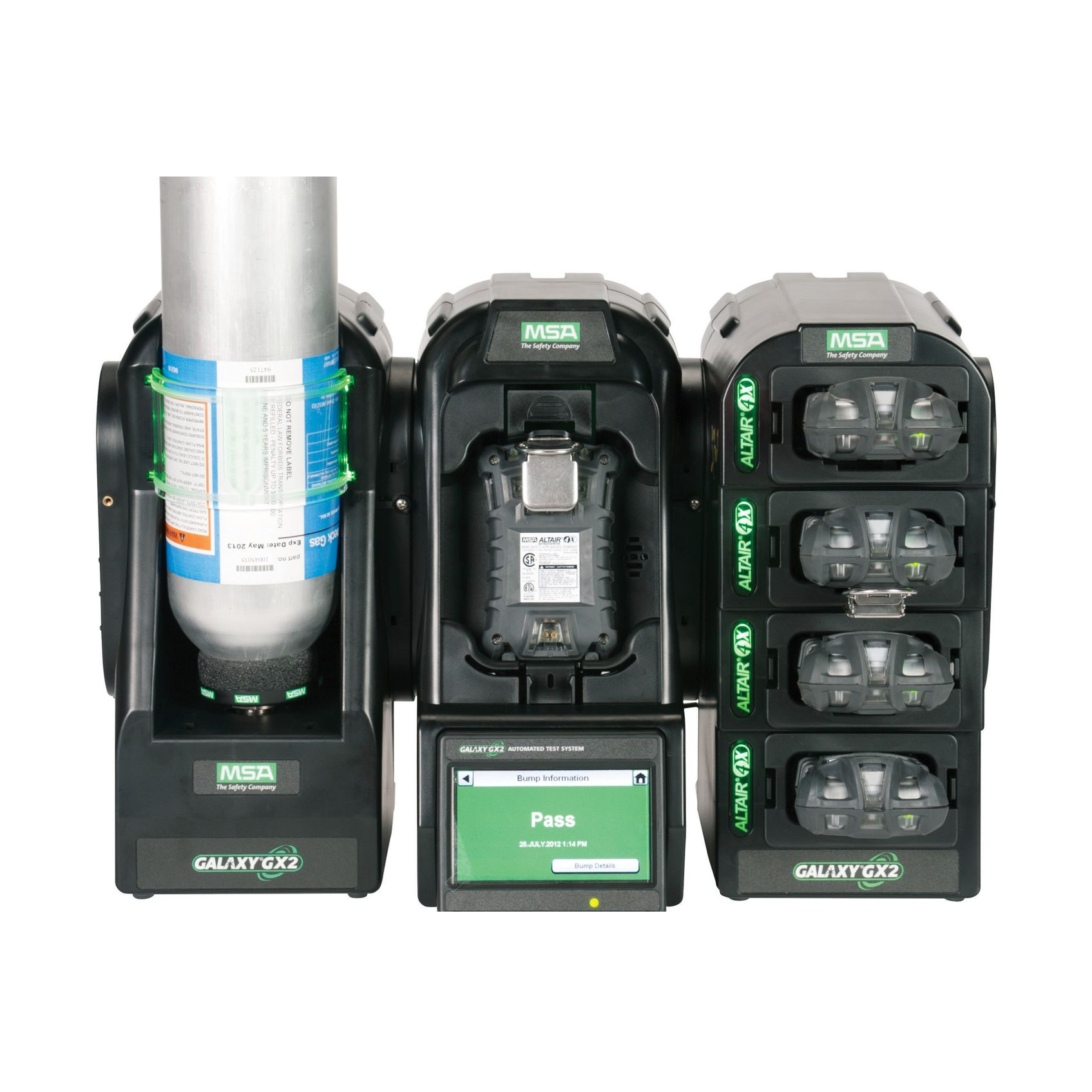 El sistema MSA Galaxy GX2 consta de 3 módulos distintos, 2 de los cuales son opcionales. Los módulos son: La estación de prueba ALTAIR, el portacilindro, y la estación de carga multiunidad.