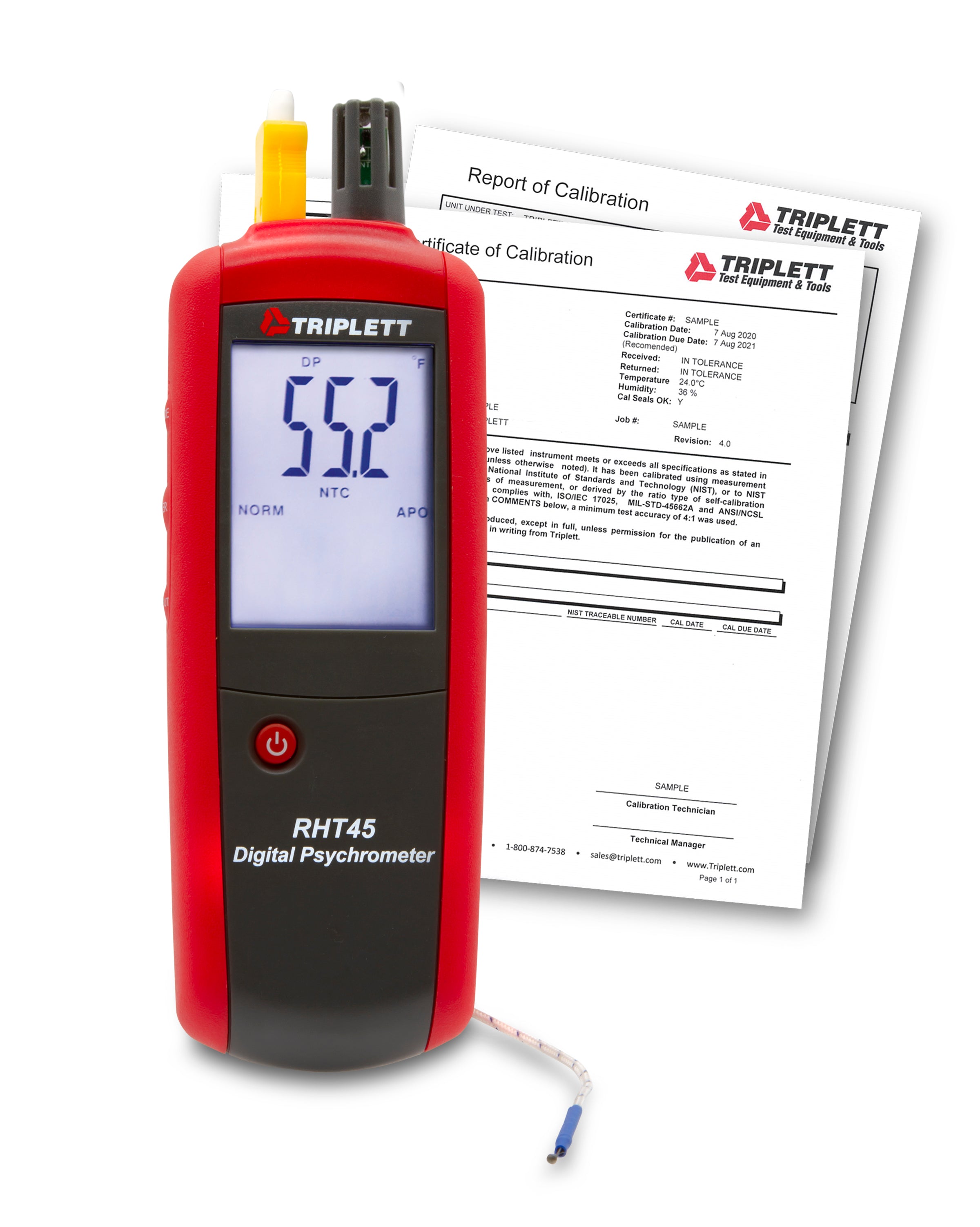 El psicrómetro digital Triplett modelo RHT45 mide la temperatura del aire, la humedad relativa, el bulbo húmedo, el punto de rocío y la temperatura tipo K. Es ideal para la inspección de edificios, la restauración de agua, invernaderos, almacenes, museos, bibliotecas, oficinas y áreas de almacenamiento. Para técnicos de climatización, los modos especializados incluyen el modo psicrómetro NORMAL, el modo de sobrecalentamiento objetivo (TSH) y el modo de temperatura objetivo de salida del evaporador (TEET). Cuenta con el modo Mín./Máx. para recuperar las lecturas más altas y más bajas, la función de retención de datos congela la pantalla para facilitar la visualización y el apagado automático con desactivación para prolongar la vida útil de la batería. Incluye certificado de trazabilidad al NIST, sonda de temperatura tipo K, (3) pilas AAA y estuche. 1 año de garantía.