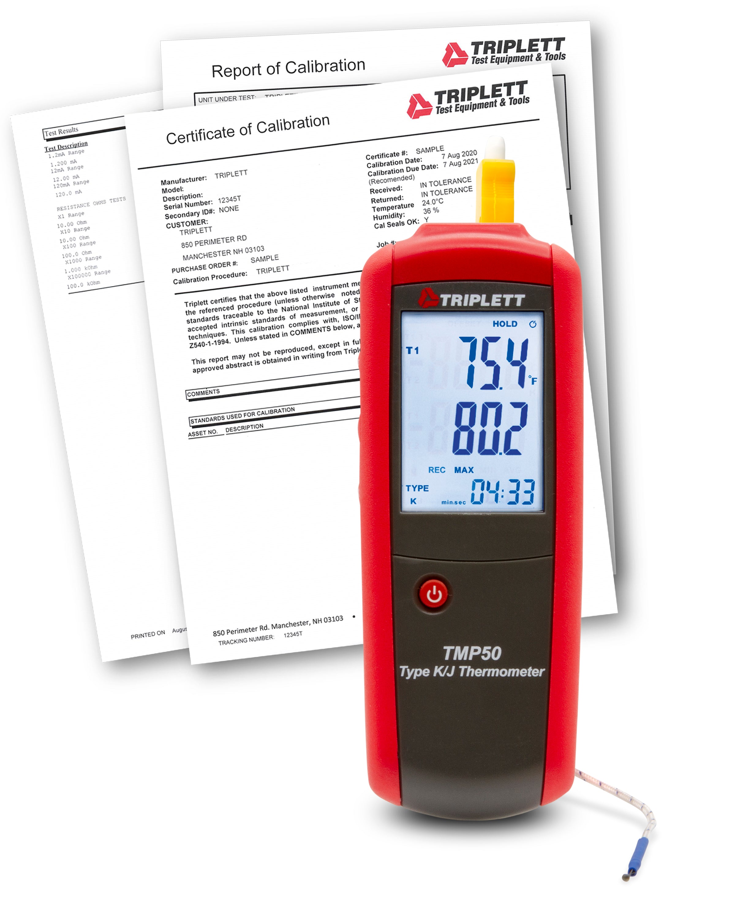 El termómetro Triplett modelo TMP50 de una sola entrada tipo K (-328 a 2501 °F/-200 a 1372 °C) / tipo J (-346 a 2012 °F/-210 a 1100 °C) cuenta con una pantalla retroiluminada doble con lectura de temperatura en °C, °F o °K. Permite medir la temperatura superficial de objetos sólidos, así como la de líquidos y la temperatura ambiente (aire). Cuenta con compensación de sonda ajustable, valores mínimos/máximos/promedio con referencia de tiempo transcurrido, función de retención de datos que congela las lecturas en la pantalla para facilitar su visualización y apagado automático programable con desactivación para prolongar la vida útil de la batería. Incluye certificado de trazabilidad al NIST, 3 pilas AAA, sonda de termopar tipo K y estuche. 1 año de garantía.
